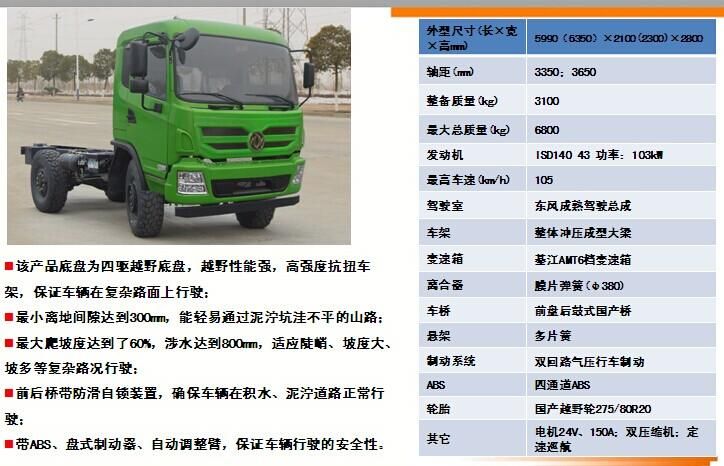 新聞中心EQ2070GZ4DJ越野四驅(qū)底盤的詳細描述:該產(chǎn)品底盤為四驅(qū)越野底盤,越野性能強,高強度抗扭車架,保證車輛在復雜路面上行駛時,不會出現(xiàn)大梁斷裂等情況;最小離地間隙達到300mm,能輕易通過泥濘坑洼不平的山路;最大爬坡度達到了60%,適應陡峭、坡度大、坡多等復雜路況行駛。前后橋帶防滑自鎖裝置,確保車輛在積水、泥濘道路正常行駛;帶ABS、盤式制動器、自動調(diào)整臂,保證車輛行駛的安全性。