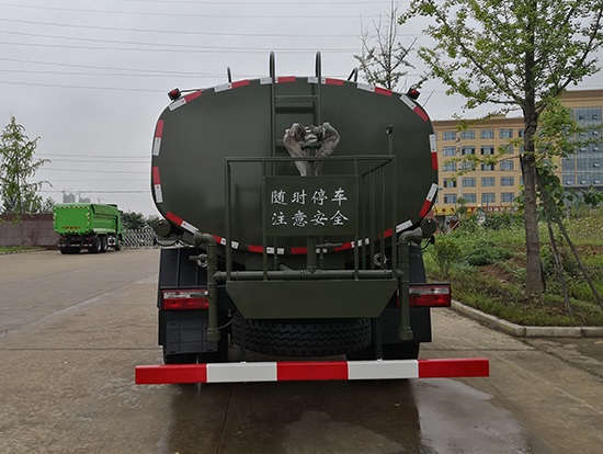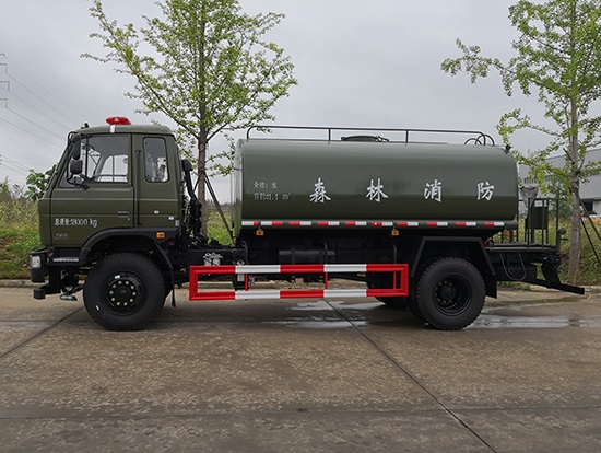 采用東風EQ2180GD5DJ型越野汽車底盤,東風一排半寬體駕駛室,4×4驅動,康明斯ISB190 50國五發(fā)動機,六檔變速箱,東風商用車橋,前驅動橋3.8噸,后橋10噸,10.00R20輪胎,軸距4500mm,電動玻璃,方向助力,斷氣剎,ABS。罐體采用優(yōu)質碳鋼QB235板材,板材厚度4mm,罐體容積11.1立方,變速箱安裝取力器,大功率水泵可泵進泵出,后置工作平臺帶水炮射程25米,消防栓接口左右各一個,選裝駕駛室頂部安裝長條警燈帶喊話器,全車顏色軍綠,兩側噴涂白色森林消防字樣。