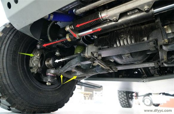 東風(fēng)四驅(qū)裝甲防雷反恐戰(zhàn)車為前置動(dòng)力、實(shí)時(shí)四輪驅(qū)動(dòng)設(shè)定,縱置發(fā)動(dòng)機(jī)(白色箭頭)直接與變速器(綠色箭頭)剛性連接,通過中間傳動(dòng)軸(黃色箭頭)至分動(dòng)器,在經(jīng)過前傳動(dòng)軸(紅色箭頭)與后傳動(dòng)軸將動(dòng)力輸出至前后驅(qū)動(dòng)橋。