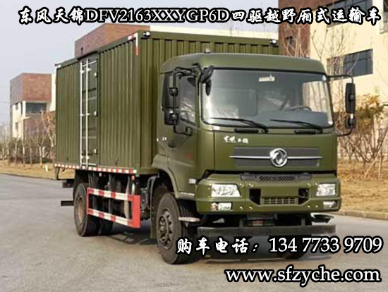 東風(fēng)天錦四驅(qū)越野廂式運(yùn)輸車(chē)(國(guó)六排放)可以上牌了!東風(fēng)牌DFV2163XXYGP6D型四驅(qū)越野廂式運(yùn)輸車(chē):整車(chē)外形尺寸長(zhǎng)寬高7760,7960X2500,2550X3380,3580(mm)、廂體內(nèi)部尺寸長(zhǎng)寬高5400,5600X2400,2450X1900,2100(mm);廂體選裝瓦楞板設(shè)計(jì),底板4mm花紋板,后對(duì)開(kāi)門(mén),側(cè)單開(kāi)門(mén)。適用于山區(qū)道路、戈壁灘道路的物資運(yùn)輸。